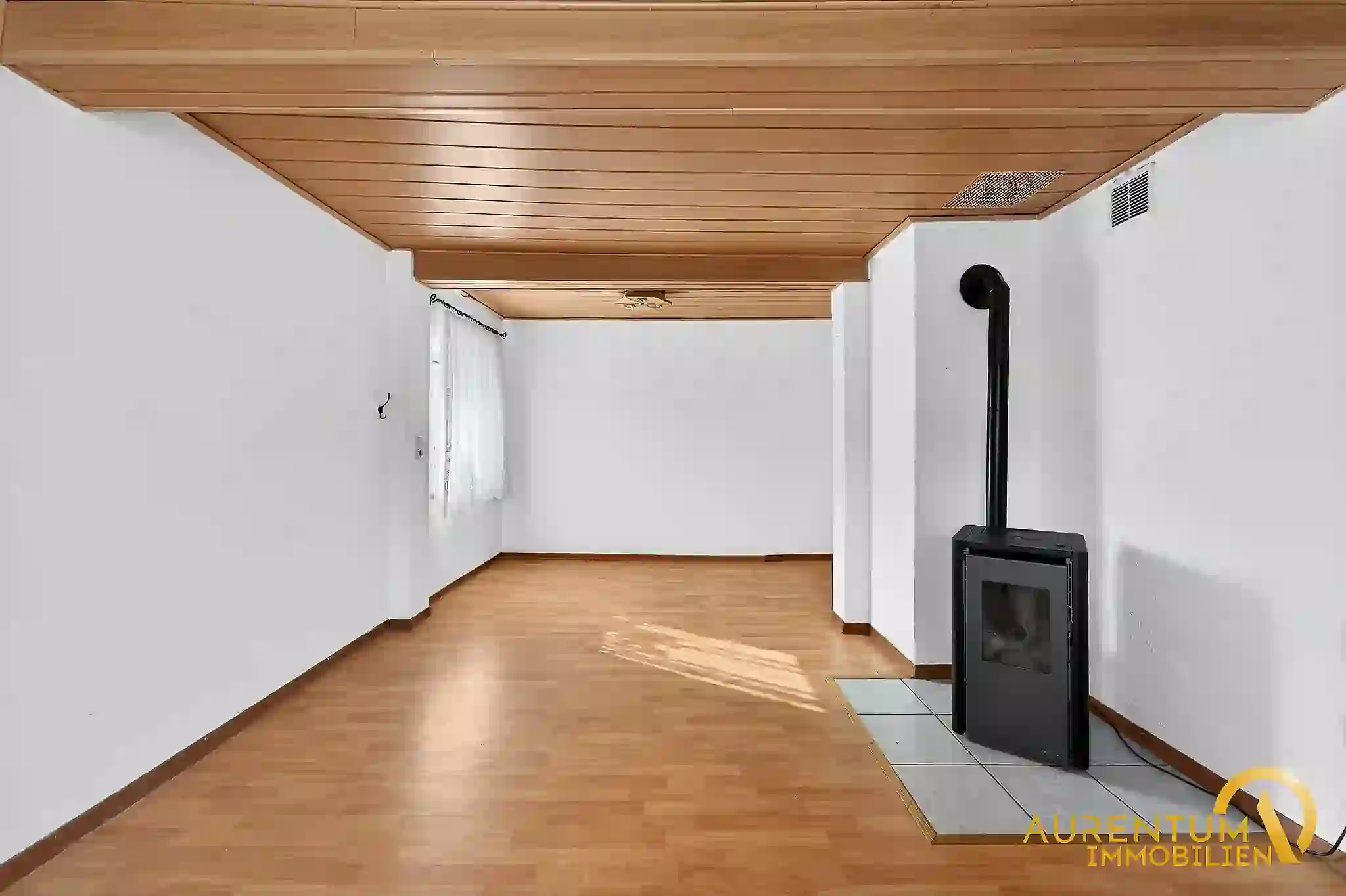 Das Wohnzimmer ist separat angeordnet und ebenfalls mit einem Pelletofen ausgestattet. Hier schaffen Laminatboden und die Ofenwärme eine besonders gemütliche Atmosphäre.