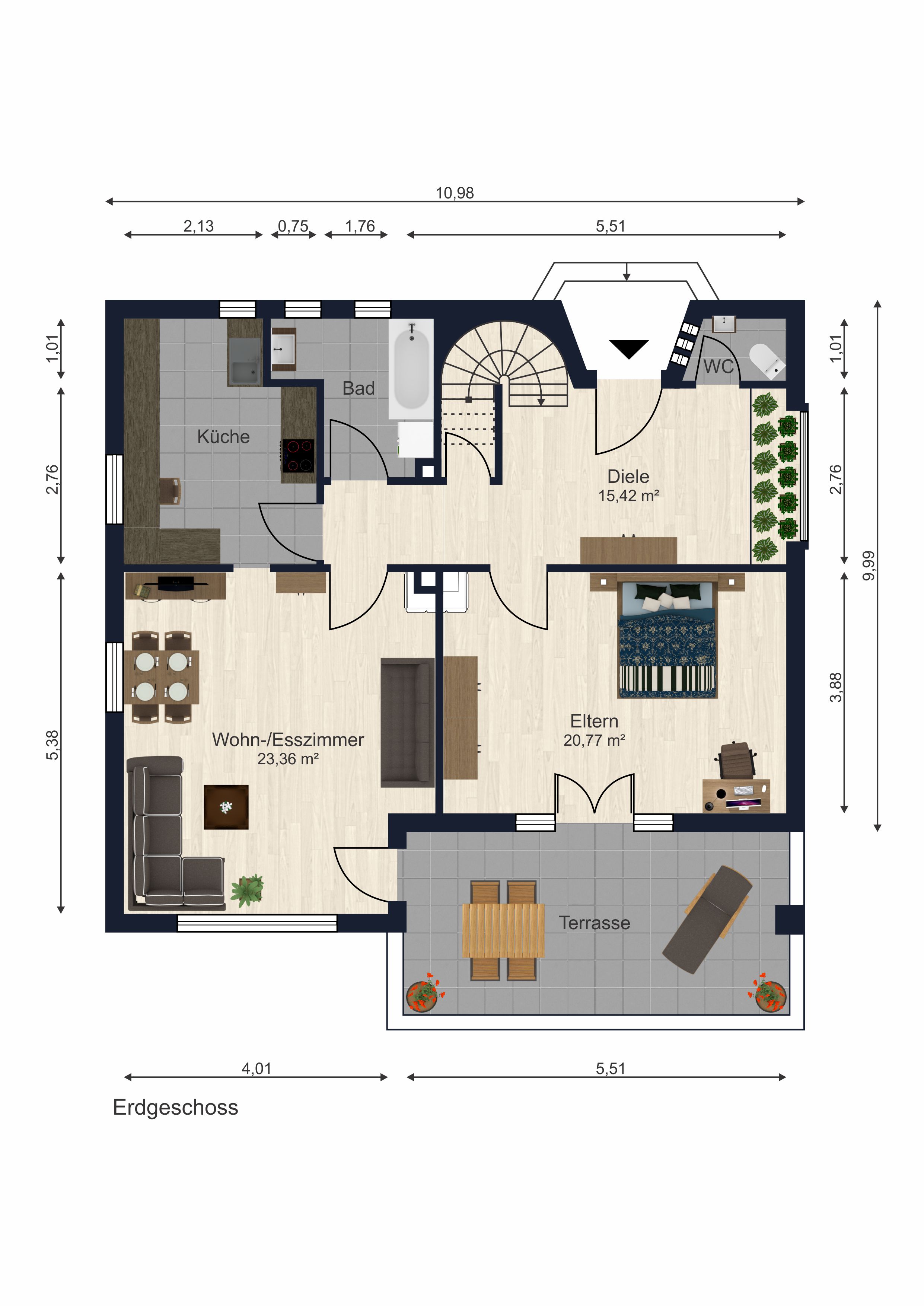 Im Erdgeschoss gelangen Sie über den Windfang in einen hellen, großzügigen Flur mit Garderobenmöglichkeit und schönem Blick in den Garten. Von hier aus erreichen Sie ein Gäste-WC mit Fenster sowie ein Büro oder Schlafzimmer mit direktem Zugang auf die Terrasse und in den Garten. Weitere Räume auf dieser Ebene sind ein Tageslichtbad mit Badewanne, Dusche und Waschmaschinenanschluss, eine weitläufige Wohnküche mit Einbauküche sowie das gemütliche Wohnzimmer, das mit seinem Ausblick in den Garten den Mittelpunkt des Hauses bildet.