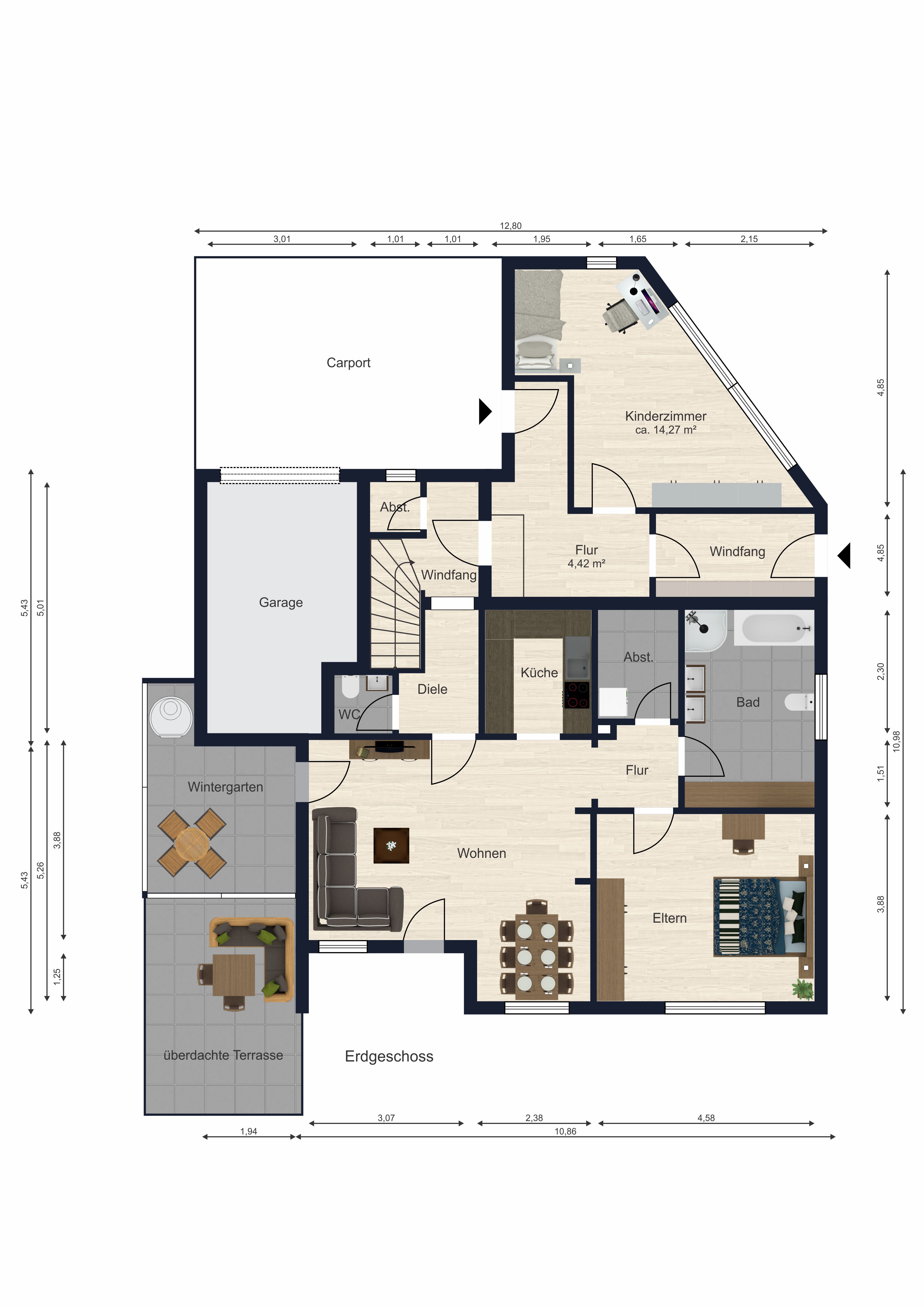 Im Erdgeschoss empfängt Sie ein großzügiger Eingangs- und Garderobenbereich. Der im Jahr 2025 neu entstandene Anbau beherbergt ein zusätzliches Kinderzimmer und erweitert den Wohnkomfort. Neben dem Elternschlafzimmer befindet sich das großzügige Tageslichtbad, ausgestattet mit freistehender Badewanne, ebenerdiger Dusche, Doppelwaschbecken, hochwertigen Armaturen, Handtuchwärmer und WC – ein echter Wohlfühlraum.