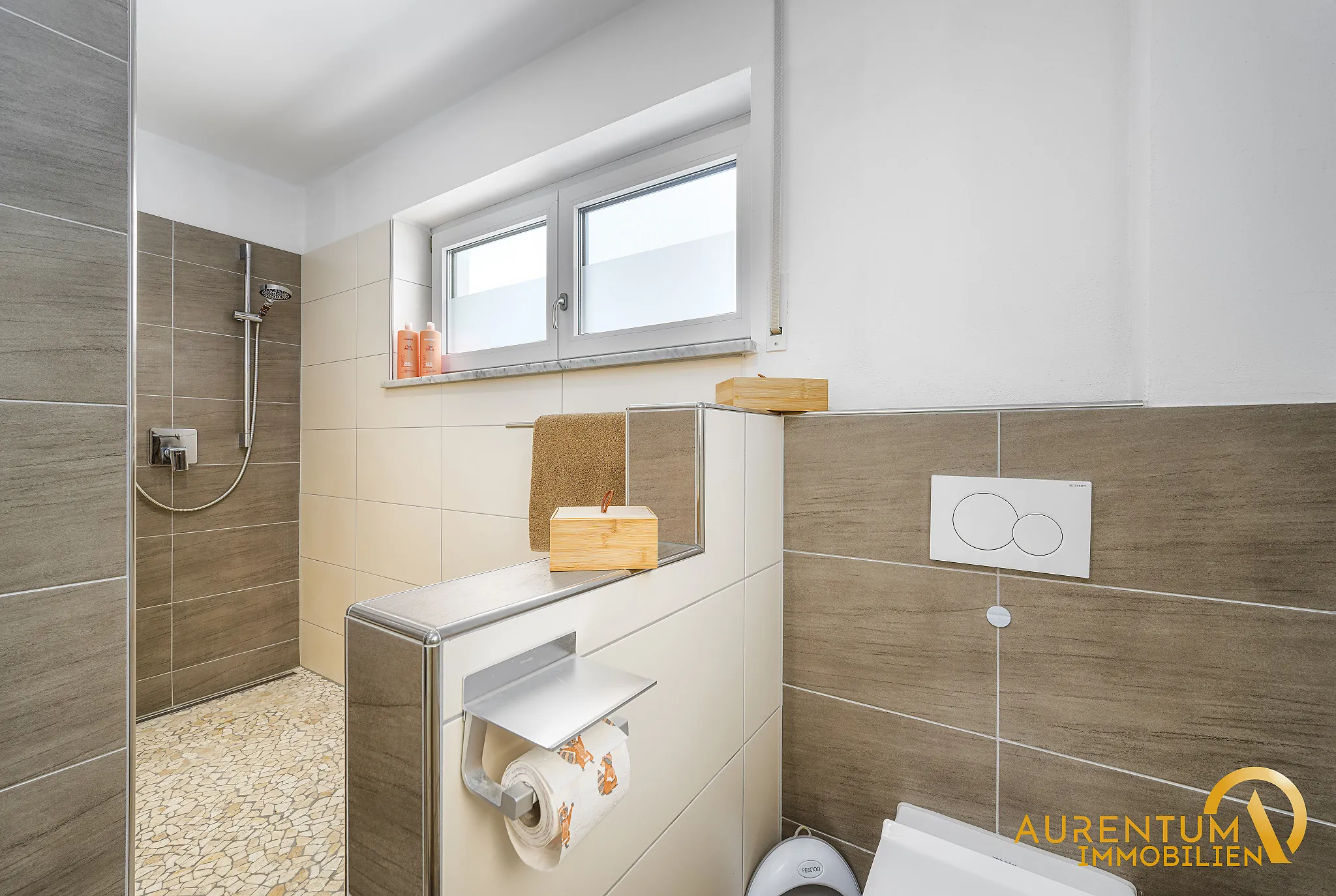 - Badezimmer mit großen Dusche, Grohe Armaturen, geschmackvoll gefliest, ebenerdig