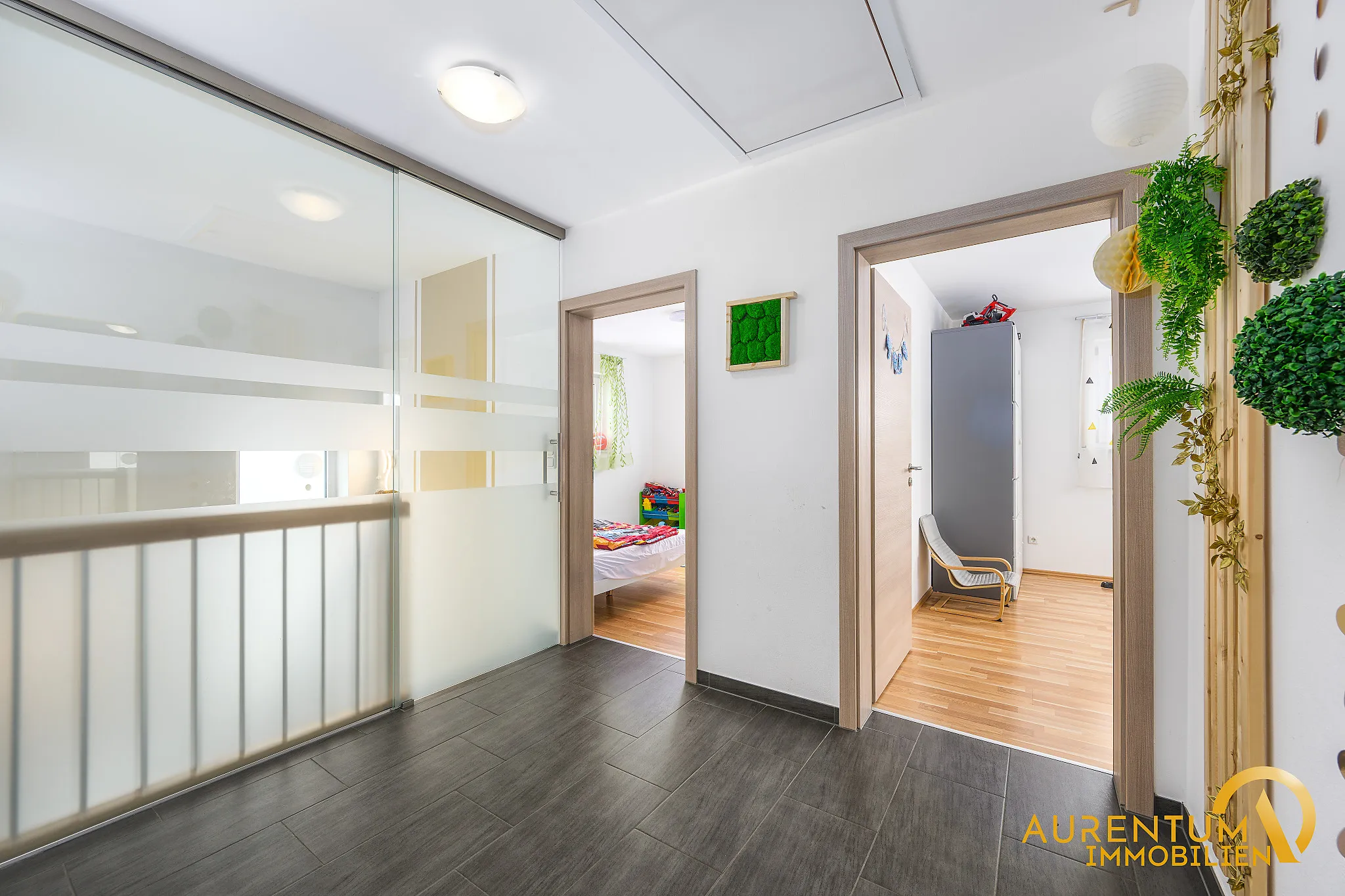 Im Obergeschoss befinden sich zwei Kinderzimmer und das Hauptschlafzimmer mit angrenzendem, begehbaren Ankleidezimmer. Das Hauptbad wurde in schönen Farbtönen gefliest und mit einer Eckbadewanne, sowie einer großzügigen, ebenerdigen Dusche ausgestattet. Der obere Flurbereich lässt sich durch eine schalldämmende Glas-Schiebetür zum Treppenhaus schließen. Somit werden die schlafenden Kinder im Obergeschoss durch einen möglichen Lärm durch Feierlichkeiten oder Besuch nicht gestört. Der Zugang zum Spitzboden (Kaltdach) erfolgt über das obere Geschoss.