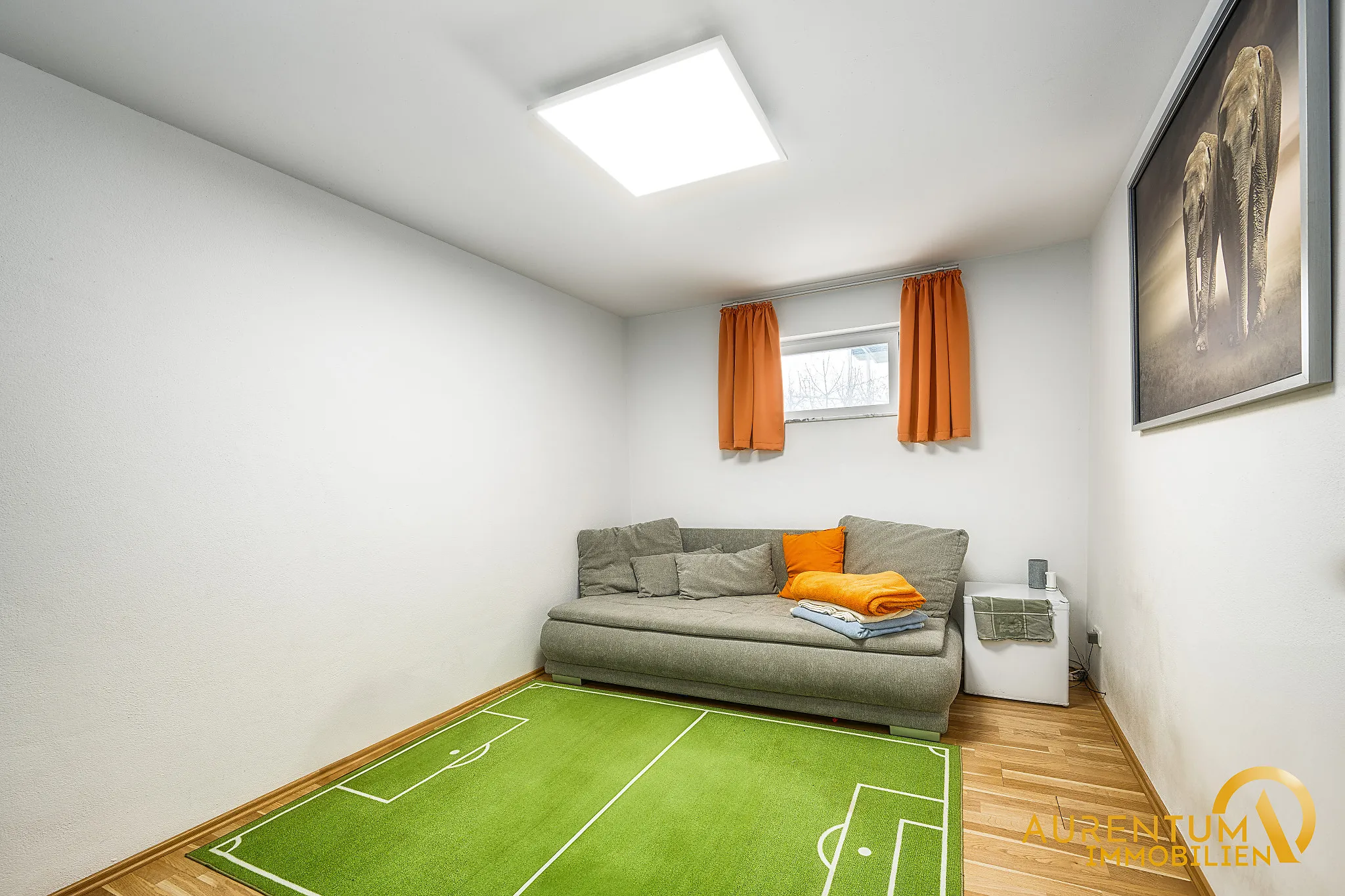 Die massive, geflieste Treppe mit Handlauf aus Buche und Edelstahlsprossen, ist durchgängig vom Obergeschoss bis in den Keller. Der Keller ist ebenso, wie das restliche Anwesen, mit einer Fußbodenheizung ausgestattet (bis auf Haustechnik und HWR-Raum). Durch die angenehme Deckenhöhe von 2,34m sind hier noch weitere drei Zimmer, die als Schlafräume Büro oder als kleine Einliegerwohnung genutzt werden könnten. Ein zusätzliches Badezimmer mit ebenerdiger Dusche und WC ist ebenso vorhanden.