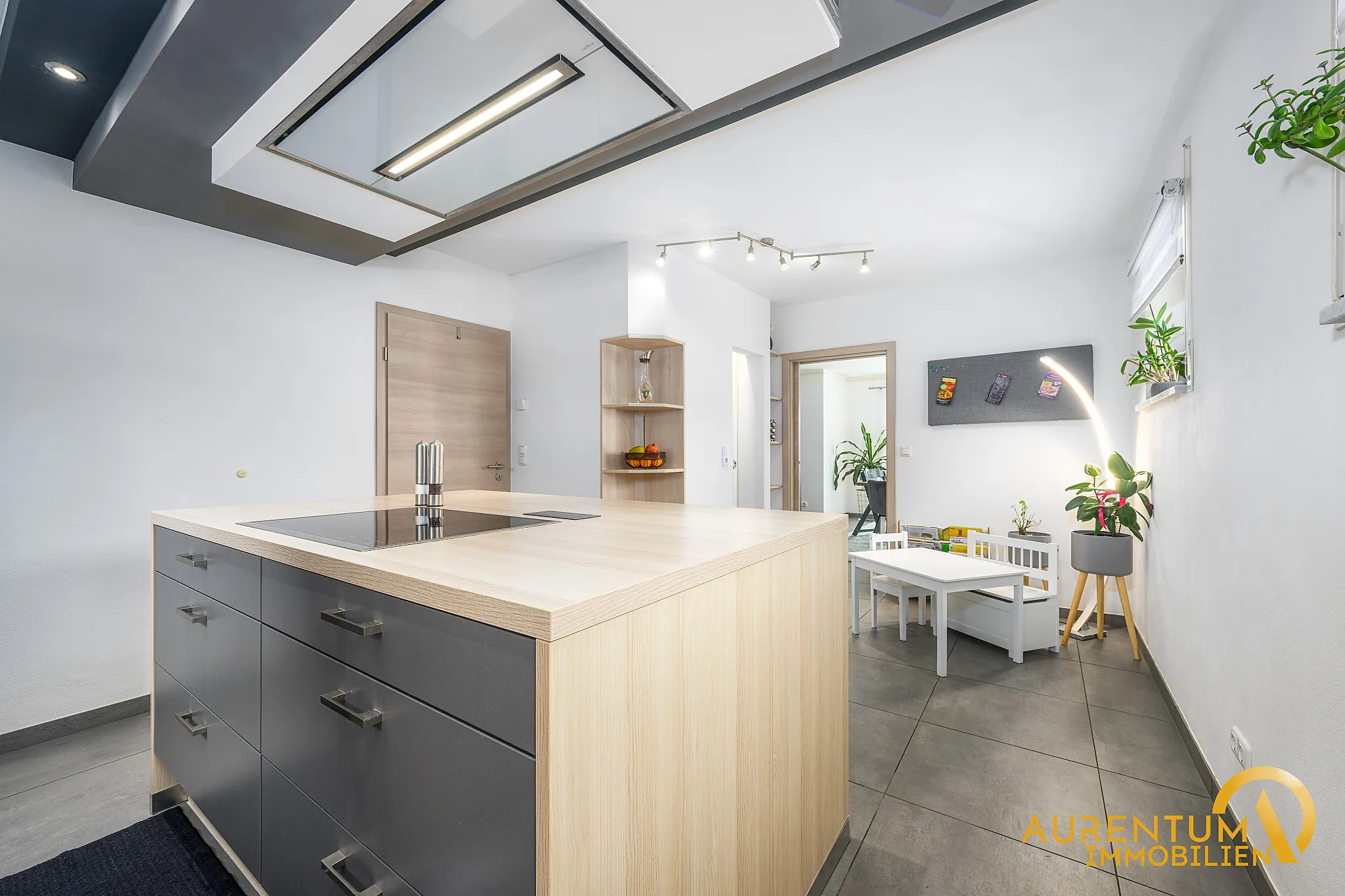 In der angrenzenden Wohnküche, samt Einbauküche, mit Kücheninsel, Markenelektrogeräten (Miele, Siemens, AEG, usw...) kann sich kulinarisch ausgetobt werden. Die nachträglich angebrachte zusätzliche Speisekammer kann entfernt werden, damit hier noch ein großer Esstisch platz findet.