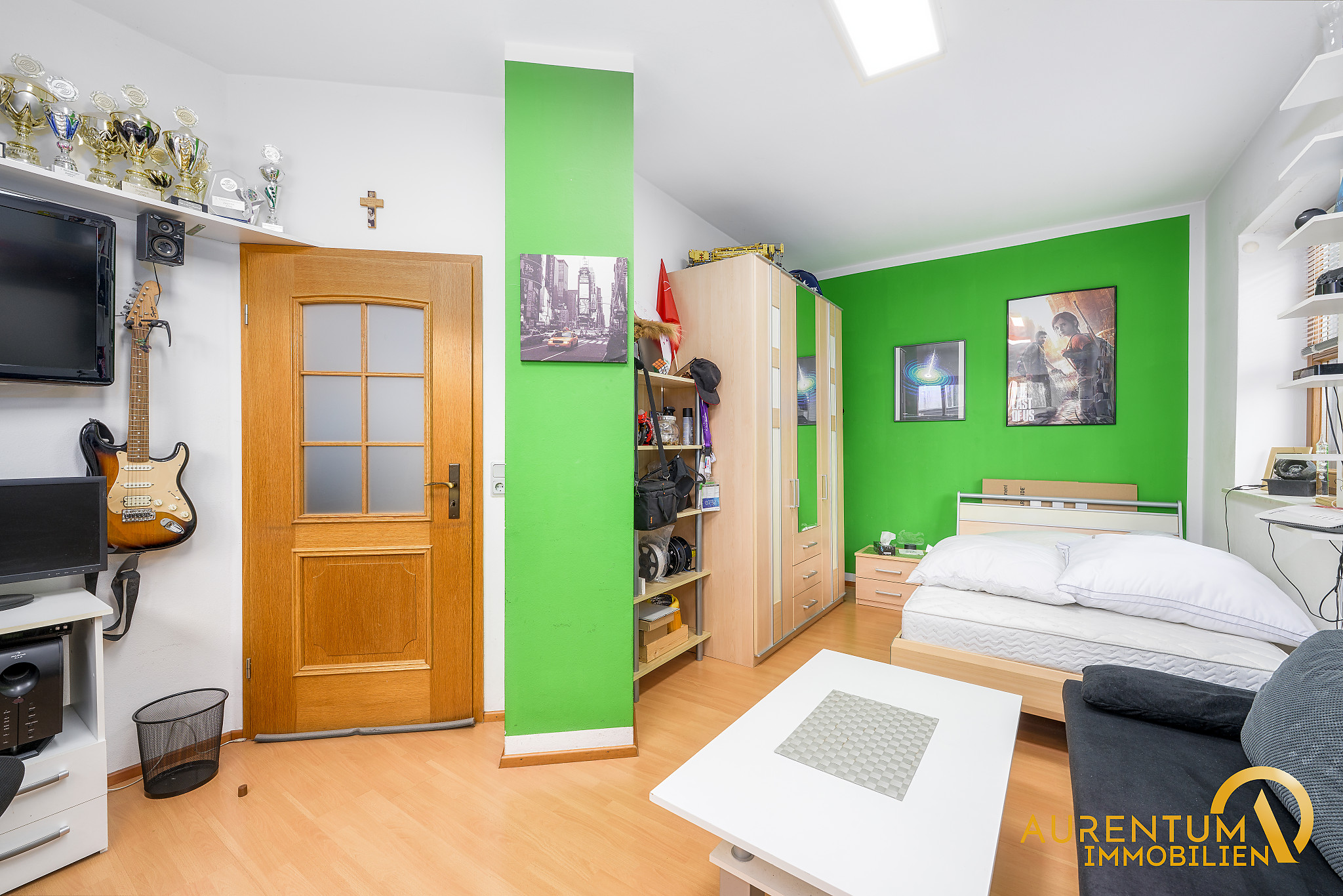 Im Erdgeschoss befindet sich eine separate Einliegerwohnung mit eigenem Zugang. Diese umfasst zwei Zimmer – ein Schlafzimmer sowie ein Kinderzimmer oder Büro – und bietet ein helles, geräumiges Wohnzimmer, eine Wohnküche, eine praktische Speisekammer bzw. einen Abstellraum sowie direkten Zugang zum Keller. Durch separate Zähler für Strom, Wasser und Heizung ist eine eigenständige Abrechnung problemlos möglich – perfekt für eine Vermietung oder die Nutzung als Gewerbeeinheit (z. B. Büro, Versicherungsmakler oder Praxis).
