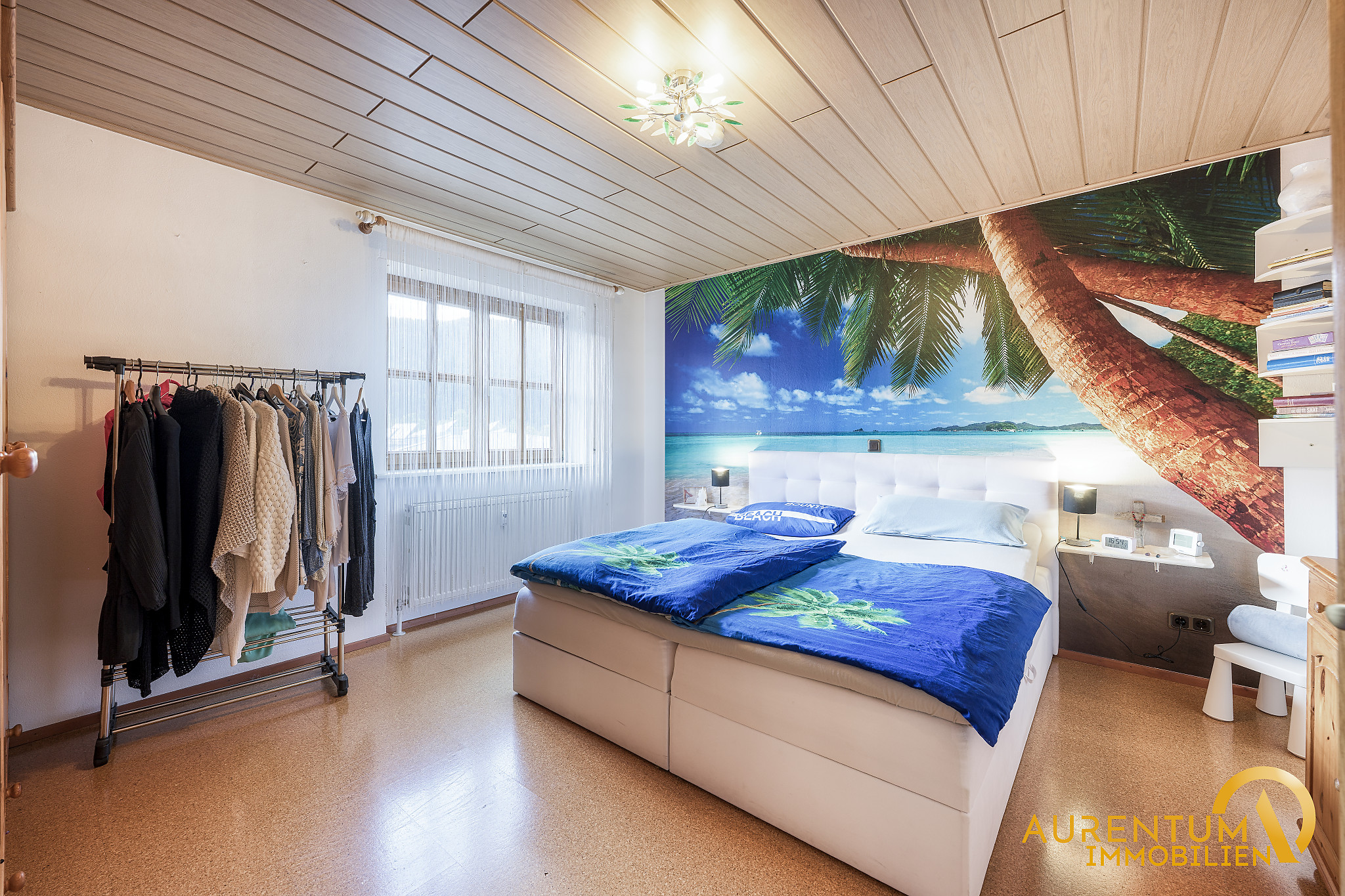 Das Obergeschoss erreichen Sie über ein helles Treppenhaus. Hier befindet sich eine großzügige Hauptwohnung mit fünf Zimmern, darunter drei Schlafzimmer, eine separate Küche mit Speisekammer sowie ein modernisiertes, helles Tageslichtbad. Der große Wohnbereich bietet Zugang zum Balkon mit schönem Ausblick. Über eine Außentreppe gelangen Sie zudem direkt in den Gartenbereich.