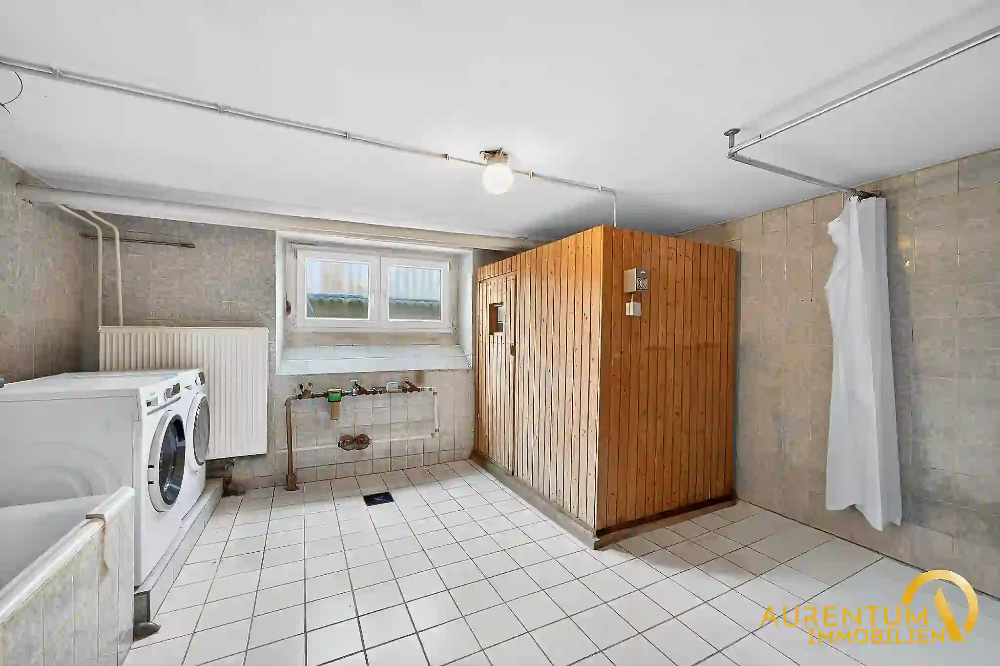 - Waschraum mit Badeanne, Waschmaschinenanschluss mit Heizkörper, Sauna, Dusche, Waschbecken