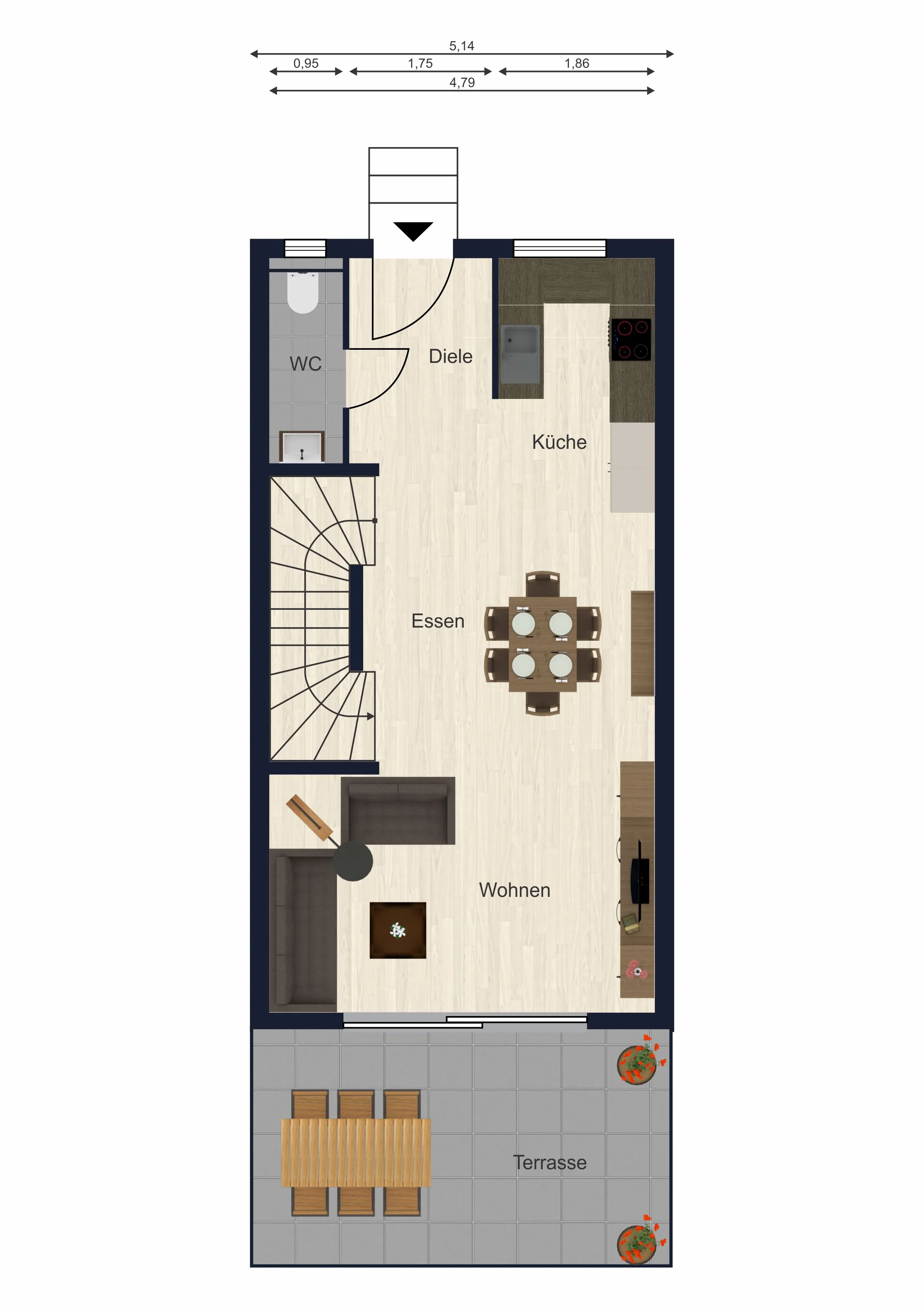 Im Erdgeschoss finden Sie neben dem Gäste-WC, eine offene Wohnküche mit Einbauküche und Markenelektrogeräten, sowie das helle Wohnzimmer mit direktem Zugang zur Terrasse und in den Garten. In dem hellen Objekt stehen insgesamt 4 Schlafzimmer zur Verfügung, diese befinden sich im 1. und 2. Obergeschoss. Die Zimmer sind jeweils mit hochwertigem Echtholzparkettboden und Fliesen ausgestattet. Fußbodenheizung, elektrische Rollos, sowie LAN Dosen in den einzelnen Zimmern, gehören hier zum Standard.