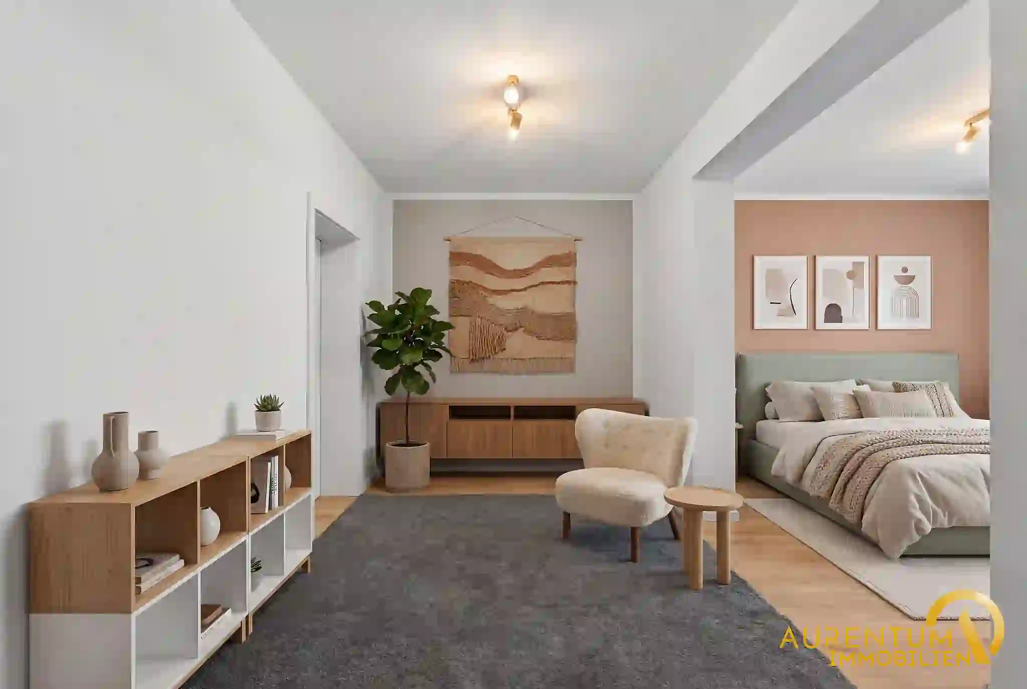 Der Grundriss ist praktisch gestaltet: Über den Eingangsbereich gelangen Sie in den offenen Wohn- und Essbereich, der ausreichend Platz für eine gemütliche Einrichtung bietet. Die separate Küche ist funktional geschnitten und gut nutzbar. Das Schlafzimmer bietet einen angenehmen Rückzugsort, während das innenliegende Badezimmer mit Dusche, Waschbecken, Handtuchwärmer und Waschmaschinenanschluss den Alltag komfortabel abrundet.