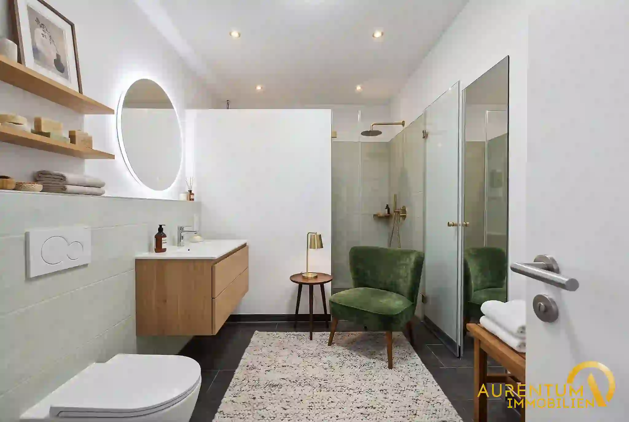 * Badezimmer mit Dusche, Handtuchwärmer, Waschbecken, innenliegend, Waschmaschinenanschluss