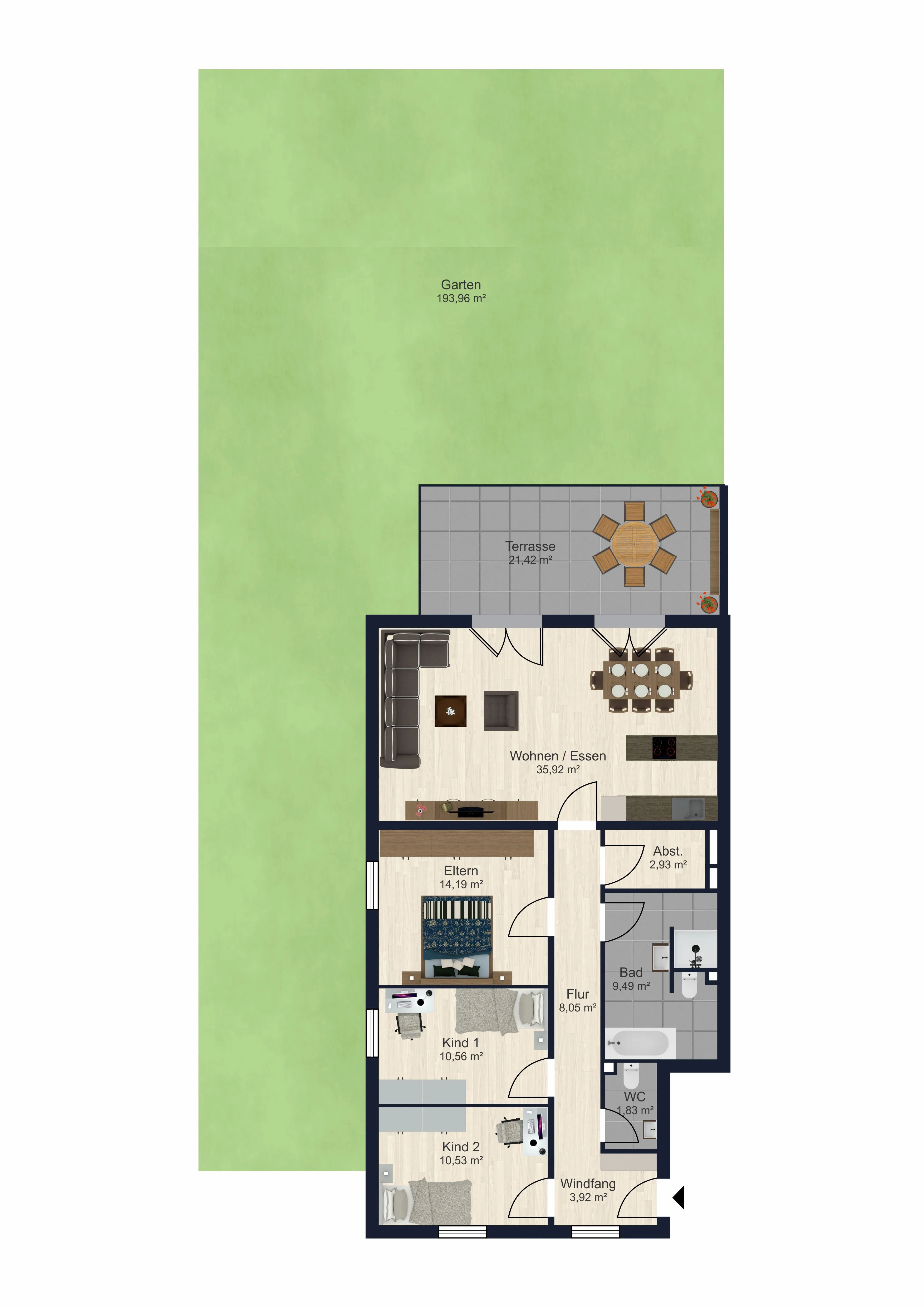 Die energieeffiziente Wohnung der Energieklasse A+ überzeugt durch einen durchdachten Grundriss, eine großzügige Raumaufteilung und lichtdurchflutete Wohnräume. Auf rund 104 m² Wohnfläche sowie zusätzliche ca. 184 m² Gartenfläche finden Familien und anspruchsvolle Eigennutzer ideale Voraussetzungen. Drei Schlafzimmer, ein helles Wohnzimmer mit offenem Essbereich und direktem Zugang zur sonnigen Südterrasse, ein modernes Badezimmer mit im Kaufpreis enthaltenen Armaturen, ein separates Gäste-WC sowie ein praktischer Abstellraum bzw. eine Speisekammer sorgen für höchsten Wohnkomfort.