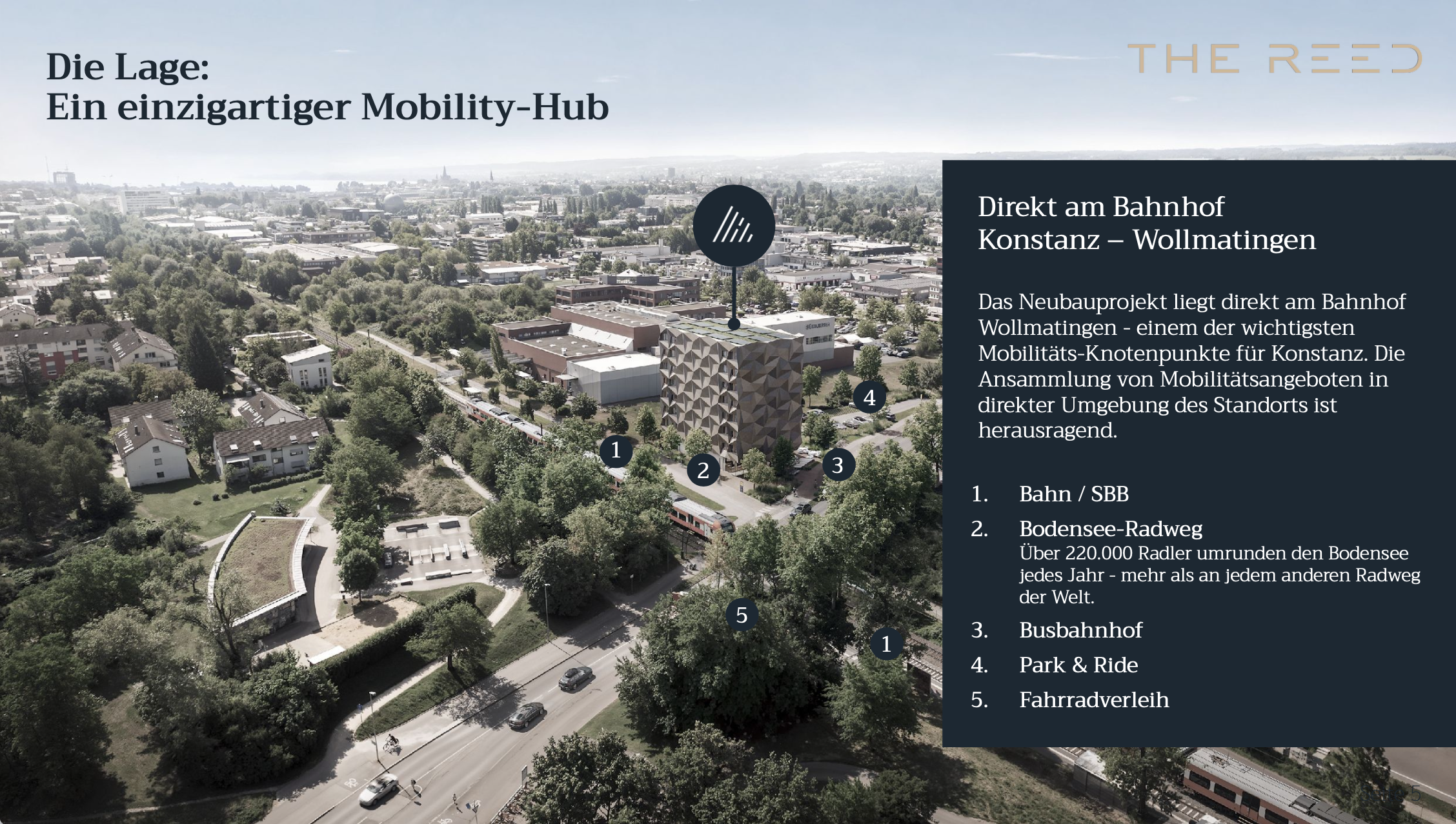 Das Hotelprojekt „The Reed“ entsteht im Stadtteil Konstanz-Wollmatingen, direkt am Bahnhof und einem zentralen Verkehrsknotenpunkt. Die Lage bietet eine hervorragende Anbindung an den regionalen und überregionalen Bahnverkehr sowie kurze Wege in die Konstanzer Innenstadt und Richtung Schweiz. Zusätzlich sorgt der nahegelegene Bodensee-Radweg für eine hohe Frequenz an Freizeit- und Radtouristen.